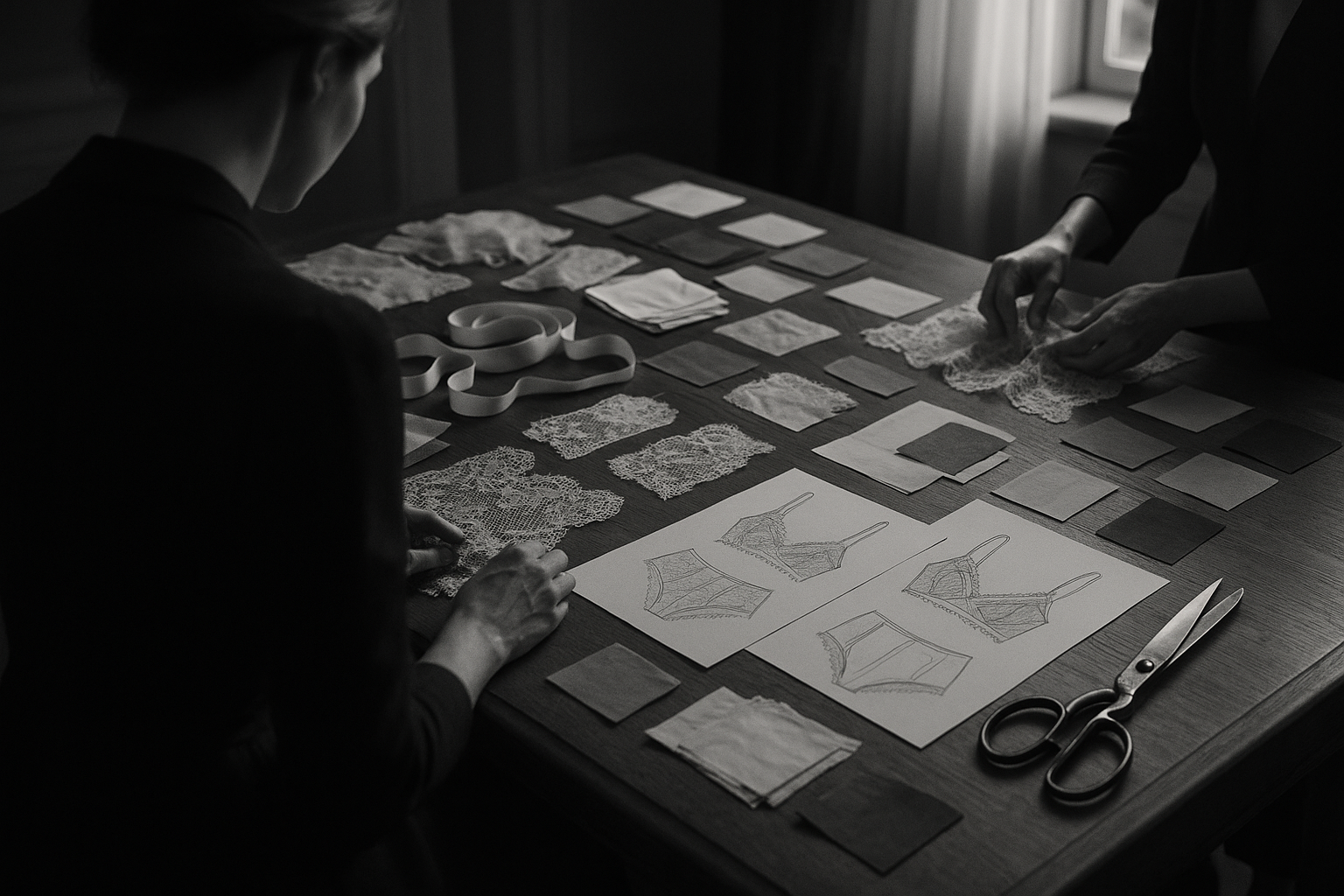 - Gwell esquisse les premières collections et choisit les meilleures matières : dentelles délicates, satins lumineux, cuirs soigneusement travaillés. Chaque tissu est sélectionné auprès de fournisseurs écoresponsables et socialement engagés, afin que la beauté des créations s’accompagne de respect et de durabilité.