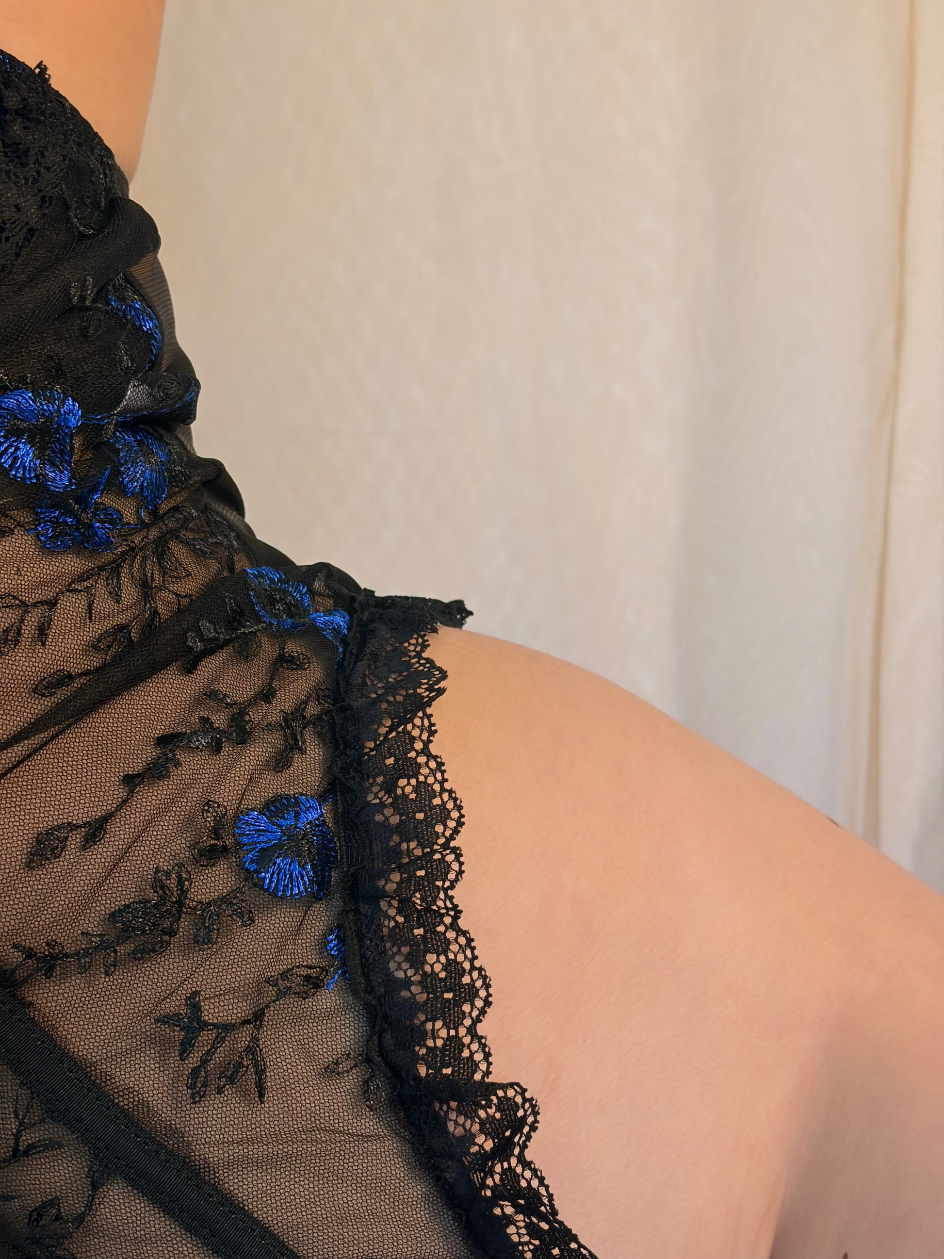 Avec Étreinte Noire, chaque détail devient une promesse de séduction. Sa dentelle délicate et son tulle raffiné sculptent les courbes dans une élégance assumée. Le décolleté plongeant et la coupe ajustée créent une silhouette audacieuse.